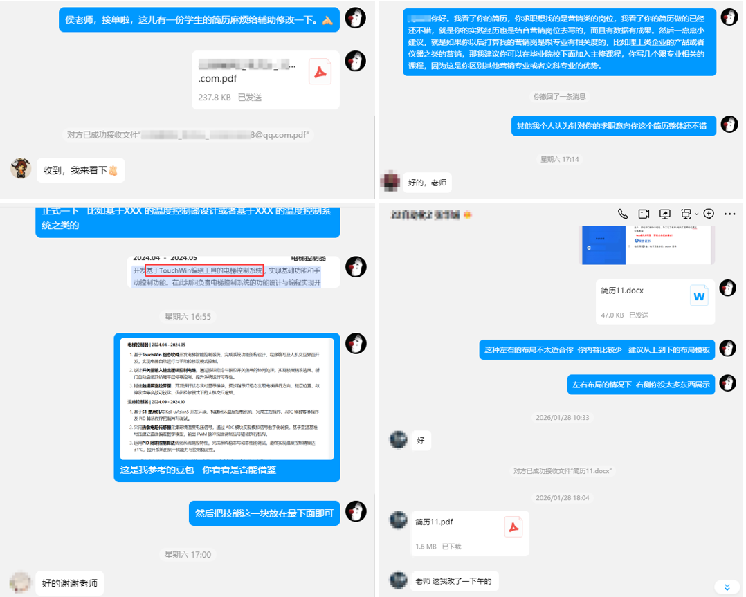 接单老师秉持严谨负责的态度,化身专业简历“诊断医师”,对每份简历进行逐字逐句细致审阅,重点围绕简历结构布局、专业技能呈现、实践经历提炼、求职意向匹配等方面,精准查找存在的问题与不足。针对简历内容空洞、重点不突出、语言表述不规范等常见问题,老师们结合学院专业就业特点和企业招聘需求,逐一提出具体、可操作的修改意见,明确优化方向,同时耐心解答学生在简历撰写、求职定位等方面的疑问,实现“一人一策、精准赋能”,助力学生打造更具竞争力的个性化简历。